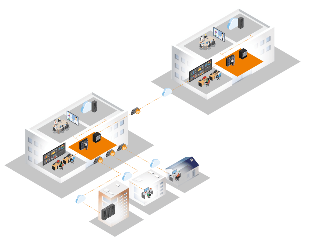 Il est également possible de relier 2 sites distants (bâtiments ou même villes) au travers d’un switch 10Gb et ainsi permettre à des utilisateurs sur un site de travailler en toute transparence sur des ressources présentes sur l’autre.
