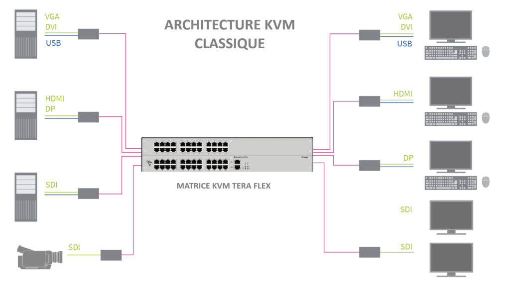 - Les matrices permettent, en fonction des besoins du projet, d’associer des cartes RJ45, fibre à des débits adaptés à des résolutions différentes, de redonder certaines fonctionnalités (alimentation, contrôleur).