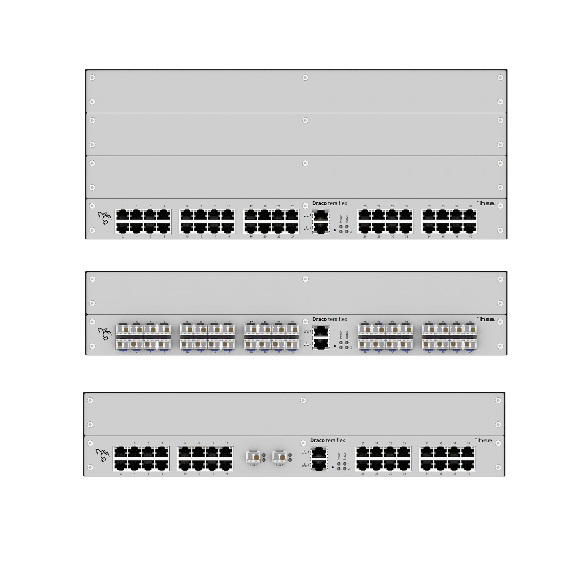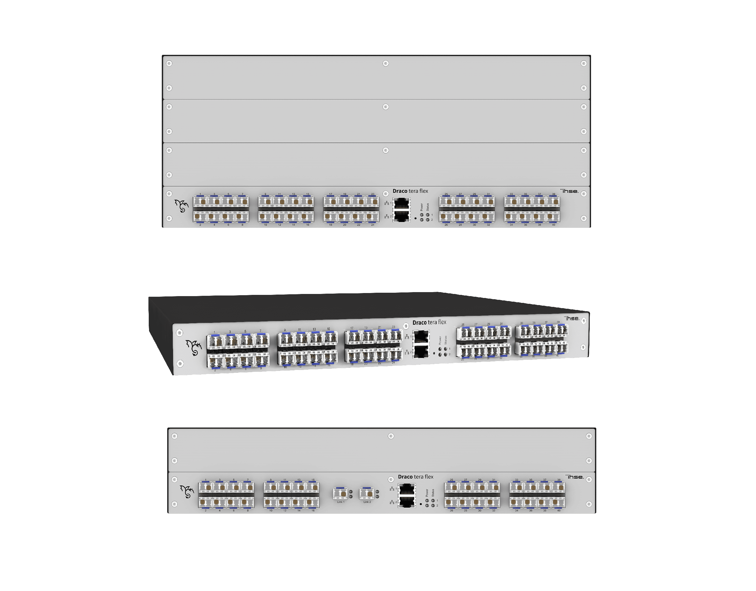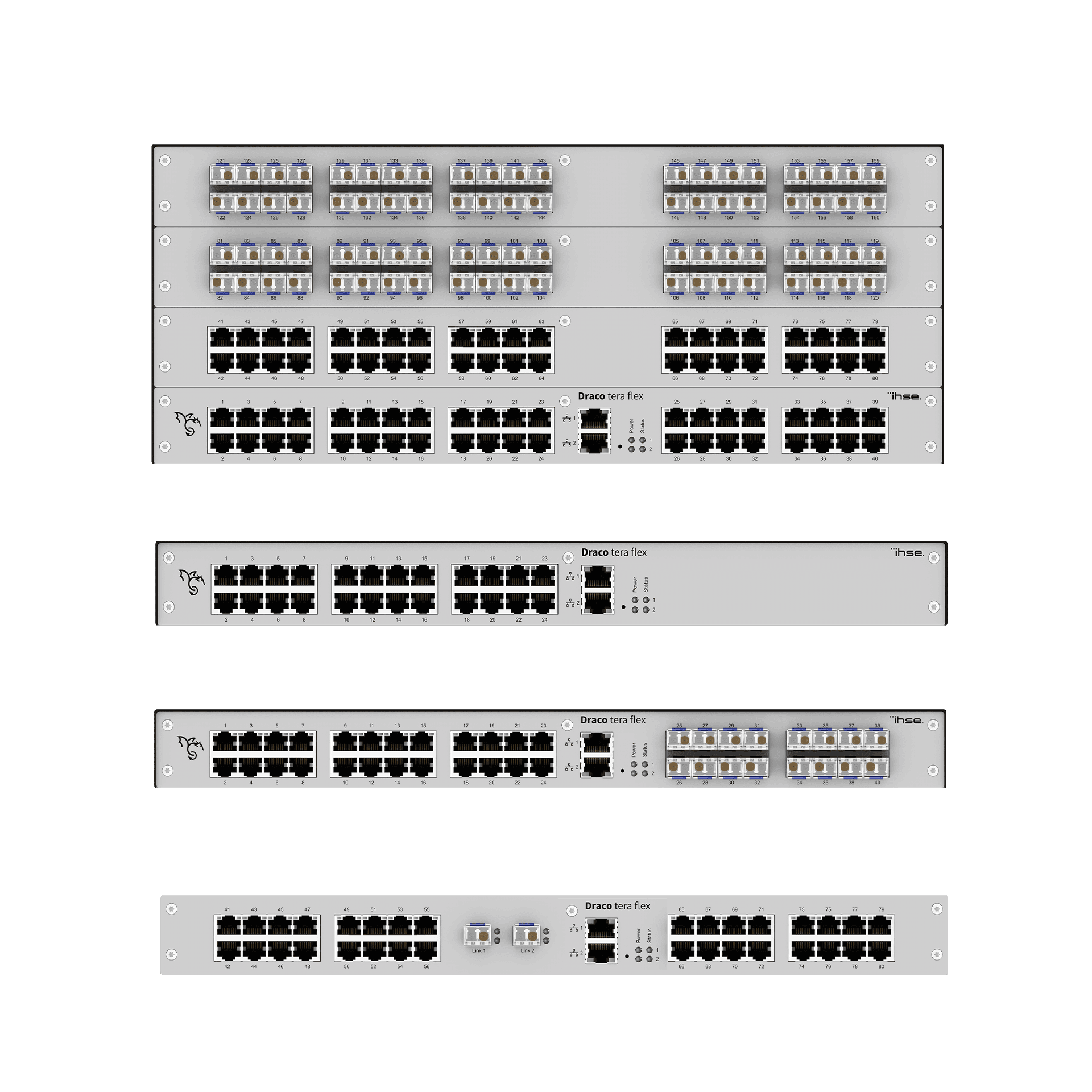 Les matrices Tera Flex sont des matrices semi-modulaires dont les dimensions compactes vont de 16 à 160 ports et peuvent atteindre 4U (1U, 2U ou bien 4U) de hauteur à raison de 40ports par 1U possible.