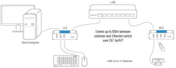 • Déport USB 2.0 et 1.1 sur CAT 5e/6/7 au travers d’un switch Gbit PoE