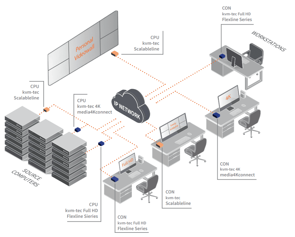 La particularité d’un système KVM utilisant la Scalableline est la possibilité de combiner en un seul ensemble un système KVM pour des applications de contrôle et de murs d’images, solutions de plus en plus présentes dans de nombreux domaines (transport, salles de contrôle et de crise, …).